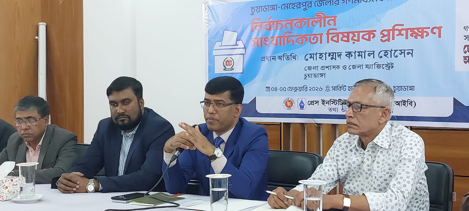 রিফাত রহমান,চুয়াডাঙ্গা প্রতিনিধি (০৫.০২.২০২৬): চুয়াডাঙ্গায় পিআইবি’র আয়োজনে দু’দিন ব্যাপি চুয়াডাঙ্গায় ও মেহেরপুর জেলায় কর্মরত গণমাধ্যমকর্মীদের নির্বাচনকালীন সাংবাদিকতা বিষয়ক প্রশিক্ষণ অনুষ্ঠিত হয়েছে।