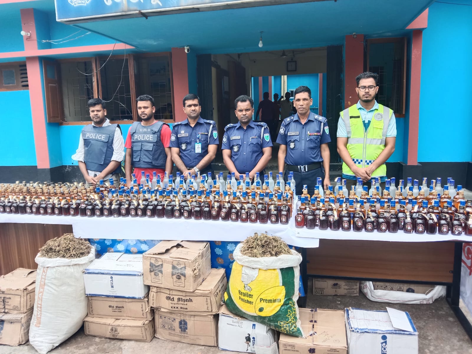 পরে পুলিশ জীপগাড়িতে তল্লাশী চালিযে ৬১৫ বোতল ভারতীয় বিভিন্ন ব্যান্ডের মদ ও ৮কেজি গাঁজা উদ্ধার, জীপগাড়ি আটক করে থানায় নিযে আসে।
