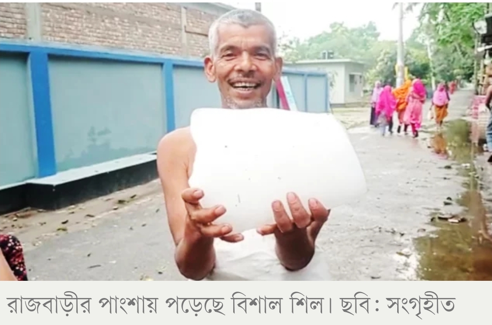 আজ শনিবার রাজবাড়ীর পাংশা উপজেলা পরিষদ চত্বরের পাশে চান্দুর মোড় এলাকায় যে শিলটি পড়েছে সেটি ৫কেজি ওজনের বলে দাবি করছেন স্থানীয় মুদি দোকানি হালিম বিশ্বাস। সামাজিক যোগাযোগ মাধ্যমে ছড়িয়ে পড়া ভিডিওতে শিলটি হাতে ধরা অবস্থায় তাঁকে বলতে শোনা গেছে, শিলটি পড়ে একটি অংশ ভেঙে গেছে। তখনই ছিল পাঁচ কেজি। যখন ভিডিওটি করা হয় ততক্ষণে এক ঘণ্টা পেরিয়ে গেছে। এরপরও তিন থেকে সাড়ে তিন কেজি অনুভূত হচ্ছে বলে জানান হালিম বিশ্বাস।
