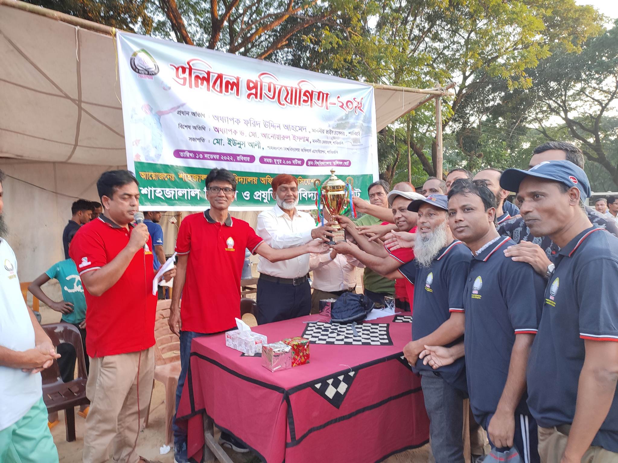 রোববার (১৩ নভেম্বর) বিকালে হ্যান্ডবল গ্রাউন্ডে এ প্রতিযোগিতার উদ্বোধন করেন বিশ্ববিদ্যালয়ের উপাচার্য অধ্যাপক ফরিদ উদ্দিন আহমেদ। ফাইনাল পর্বে কুশিয়ারা টিমকে ০-২ সেটে হারিয়ে চ্যাম্পিয়ন হয় ধলাই টিম। খেলা শেষে চ্যাম্পিয়ন এবং রানার্স আপ উভয় দলের হাতে ট্রপি ও পুরস্কার তুলে দেন বিশ্ববিদ্যালয়ের কোষাধ্যক্ষ অধ্যাপক ড. মো. আনোয়ারুল ইসলাম। প্রধান অতিথির বক্তব্যে কোষাধ্যক্ষ বলেন, কর্মকর্তারা সবসময় কাজের মধ্যে দিয়ে থাকেন। তাই অনেকের প্রতিভাকে মেলে ধরার সুযোগ থাকে না। তবে এ খেলার মাধ্যমে তা প্রকাশ করার সুযোগ হয়েছে৷ এতে কর্মকর্তাদের মাঝে একটা আন্তরিক ও সৌহার্দপূর্ণ সম্পর্ক তৈরি হয়েছে, যা তাদেরকে কাজের প্রতি উৎসাহ দিয়ে এ বিশ্ববিদ্যালয়কে এগিয়ে নিতে সহায়তা করবে। বিশ্ববিদ্যালয় প্রশাসন সবসময় এ ধরণের আয়োজনে সহযোগিতা করে।