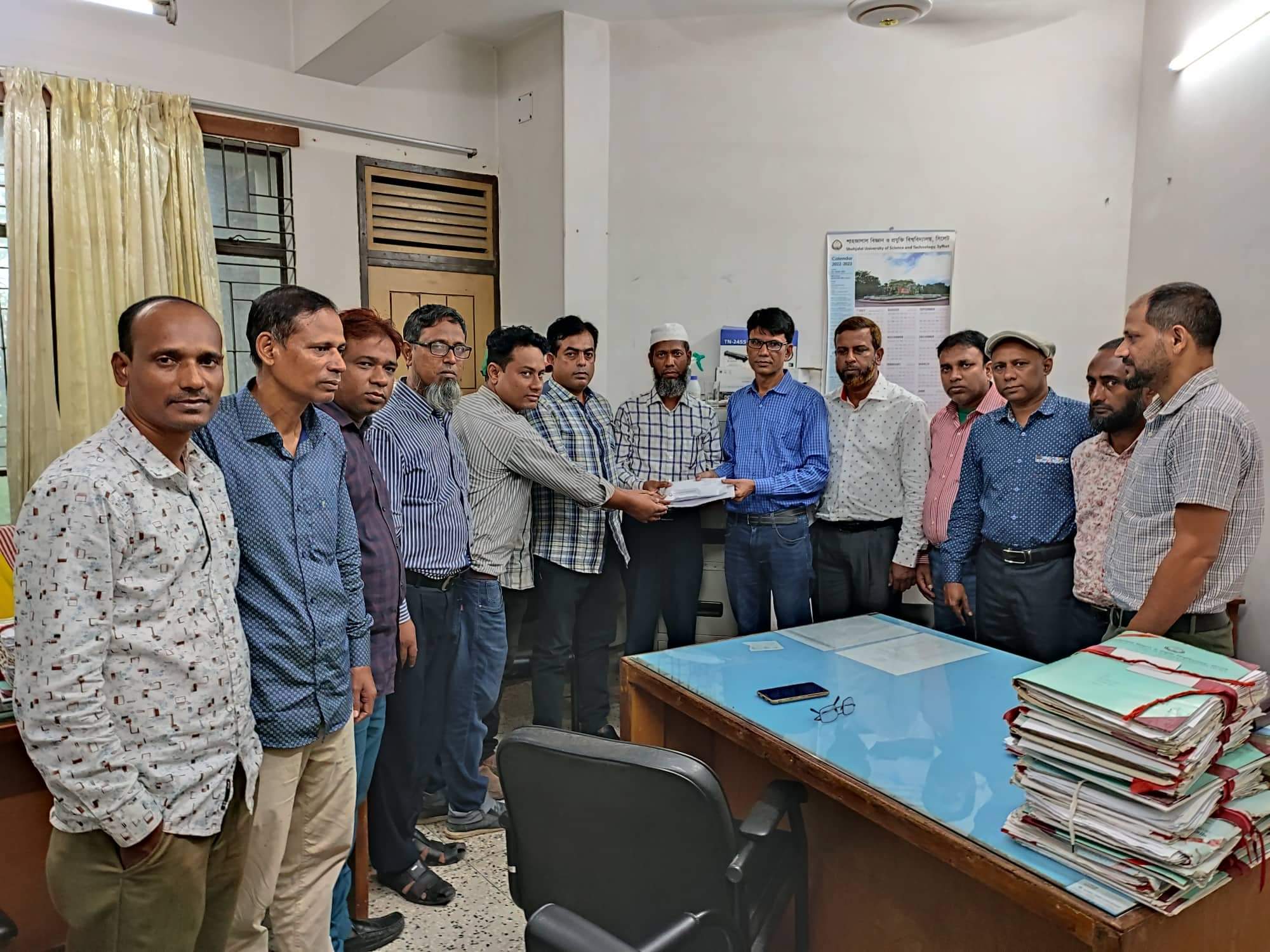 টাকা হস্তান্তরকালে শাবি অফিসার্স এসোসিয়েশনের সাধারণ সম্পাদক উপ-পরীক্ষা নিয়ন্ত্রক মখলিছুর রহমান (পারভেজ), সহ সভাপতি পরিবহণ দপ্তরের নির্বাহী প্রকৌশলী এমরান আহমদ চৌধুরী, সহ-সাধারণ সম্পাদক রেজিস্ট্রার দপ্তরের সিনিয়র সুপারভাইজার সাহেদ আহমদ ও কোষাধ্যক্ষ সহকারী রেজিস্ট্রার মোহাম্মদ মঈনুল হক, কার্যনির্বাহী সদস্য অর্থ ও হিসাব দপ্তরের উপ-পরিচালক মোহাম্মদ মুর্শেদ আহমদ, উপ-রেজিস্ট্রার (পরিকল্পনা ও উন্নয়ন) আহমদ মাহবুব ফেরদৌসী, রেজিস্ট্রার দপ্তরের প্রশাসনিক কর্মকর্তা মো. সিরাজুল ইসলাম (উজ্জ্বল), রেজিস্ট্রার দপ্তরের প্রশাসনিক কর্মকর্তা মো. মাহফুজুর রহমান, তত্ত্বাবধায়ক প্রকৌশলী মো. জয়নাল ইসলাম চৌধুরী ও ইংরেজি বিভাগের প্রশাসনিক কর্মকর্তা মোহাম্মদ আশরাফুল হক, উপ রেজিস্ট্রার মো. গিয়াস উদ্দিন খান ও মো. নাঈম উদ্দিন আহমেদ, সহ পরীক্ষা নিয়ন্ত্রক মো. ওবায়দুল হক, সহ রেজিস্ট্রার সত্ত রঞ্জন মল্লিক, প্রশাসনিক কর্মকর্তা অসিত কুমার সূত্রধর উপস্থিত ছিলেন।