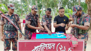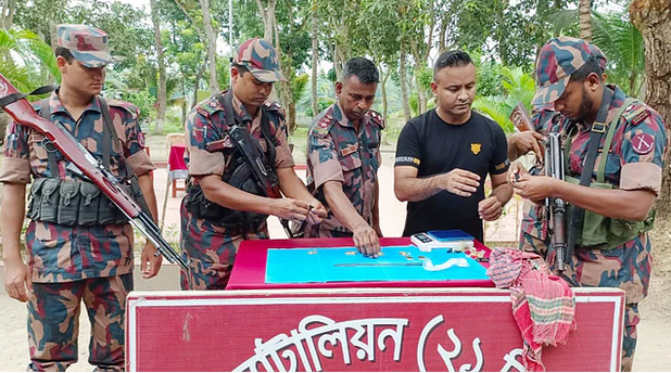 আটক ব্যক্তির নাম সাকিব হোসেন (১৯)। তিনি শার্শা উপজেলার গোগা গ্রামের কালাম হোসেনের ছেলে। বিজিবি জানায়, শার্শা উপজেলার রুদ্রপুর সীমান্ত দিয়ে অবৈধভাবে সোনা বাংলাদেশ থেকে ভারতে পাচারের চেষ্টা চলছিল। গোপন তথ্য পেয়ে ২১ বর্ডার গার্ড ব্যাটালিয়ন খুলনার অধিনায়ক লেফটেন্যান্ট কর্নেল মোহাম্মদ তানভীর রহমানের নেতৃত্বে একটি বিশেষ টহল দল আজ মঙ্গলবার সকাল ১০টার দিকে রুদ্রপুর গ্রামে একটি আমবাগানের মধ্যে অভিযান পরিচালনা করে। অভিযান চলাকালে সাকিব হোসেনকে আটক করা হয়। এরপর তাঁর কাছে থাকা একটি প্লাস্টিকের ব্যাগে ইউরিয়া সারের মধ্যে স্কচটেপ দিয়ে মোড়ানো সোনার ১০টি বার পাওয়া যায়।
