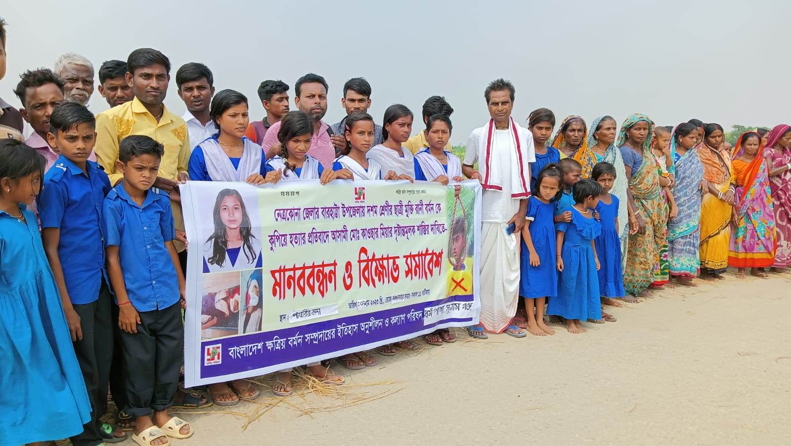 গত ২মে বিকেলে ওই স্কুল ছাত্রীকে স্কুল থেকে বাড়ি ফেরার পথে ধারালো দা দিয়ে কুপিয়ে হত্যা করে বখাটে কাওছার।আমরা এই বখাটের দৃষ্টান্তমূলক শাস্তির দাবি জানাচ্ছি পাশাপাশি মুক্তি রানী বর্মণের মতো আর কারও যাতে এ ধরণের নৃশংসও হত্যকাণ্ডের ঘটনা না ঘটে সে জন্য আইনশৃঙ্খলা বাহিনীর প্রতি তারা উদাত্ত আহ্বান জানাচ্ছি। মানববন্ধন ও বিক্ষোভ সমাবেশে বক্তব্য দেন বাংলাদেশ ক্ষত্রিয় বর্মণ সম্প্রদায়ের ইতিহাস অনুশীলন ও কল্যাণ পরিষদের সুনামগঞ্জ জেলা কমিটির সহ সভাপতি লিটন বর্মণ, ধর্মপাশা উপজেলা হিন্দু বৌদ্ধ খ্রিস্টান ঐক্য পরিষদের সদস্য সচিব চয়ন কান্তি দাস,পাথারিয়া কান্দা গ্রামের বাসিন্দা জগদীশ বর্মণ,মতি লাল বর্মণ,অমল বর্মণ,মিঠু বর্মণ,দীপ্ত বর্মণ প্রমুখ।