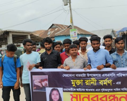 আটপাড়া (নেত্রকোনা) প্রতিনিধি : নেত্রকোনার বারহাট্টায় স্কুলছাত্রী মুক্তি বর্মণকে (১৫) কুপিয়ে হত্যার প্রতিবাদে ও গ্রেপ্তার কাউছার মিয়ার (১৮) দৃষ্টান্তমূলক শাস্তির দাবিতে মানববন্ধন হয়েছে। বৃহস্পতিবার বেলা ২টার দিকে তেলিগাতী বাজারে এ কর্মসূচি পালন…